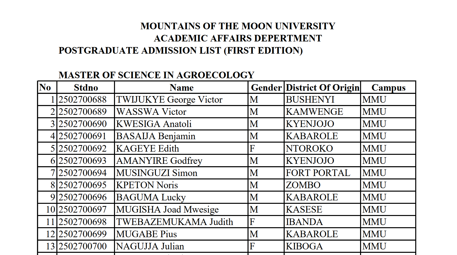 The Office of the Academic Registrar at Mountains of the Moon University (MMU) informs the public that the Postgraduate Admission Lists for the Academic Year 2025/2026 are now available. Please see the lists attached. Note: Applications submitted after 25th May 2025 are still under review. The final admission lists will be published soon.Read More