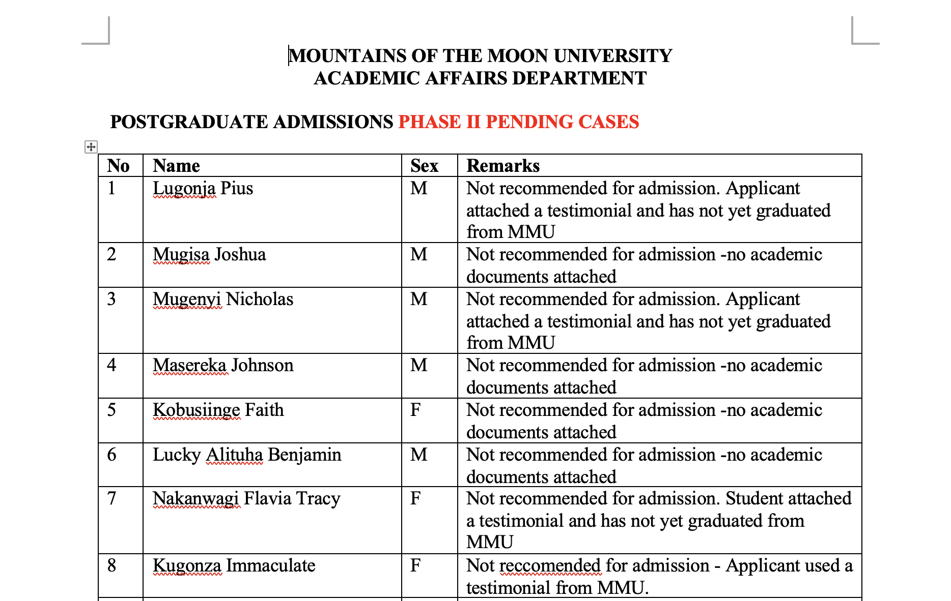 The Academic Registrar, Mountains of the Moon University, has released a list of postgraduate applicants with pending cases.These are applicants whose admissions could not be finalized due to specific issues detailed in the file. We kindly request all concerned individuals to review the list and address the indicated issues as soon as possible to facilitate...Read More