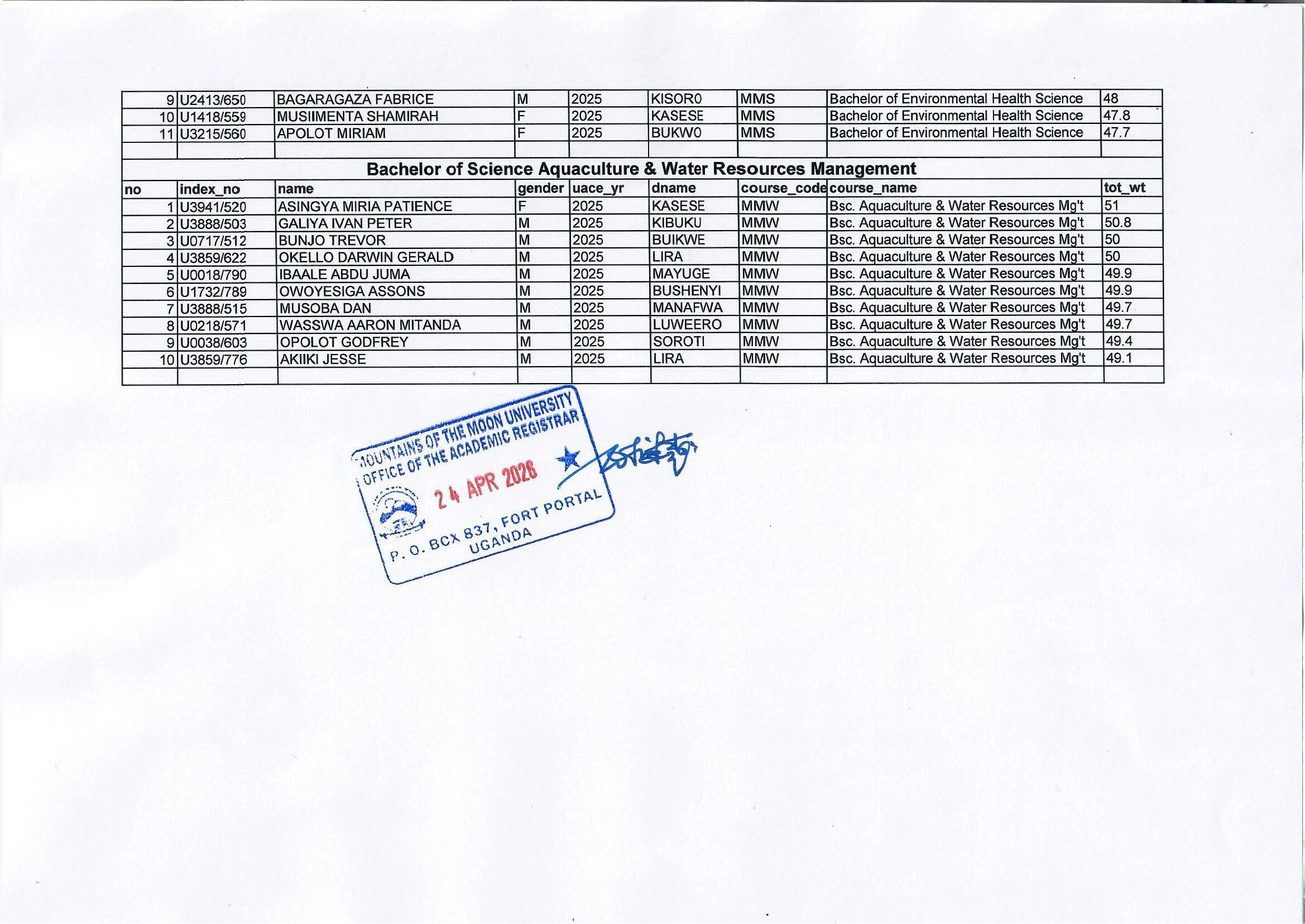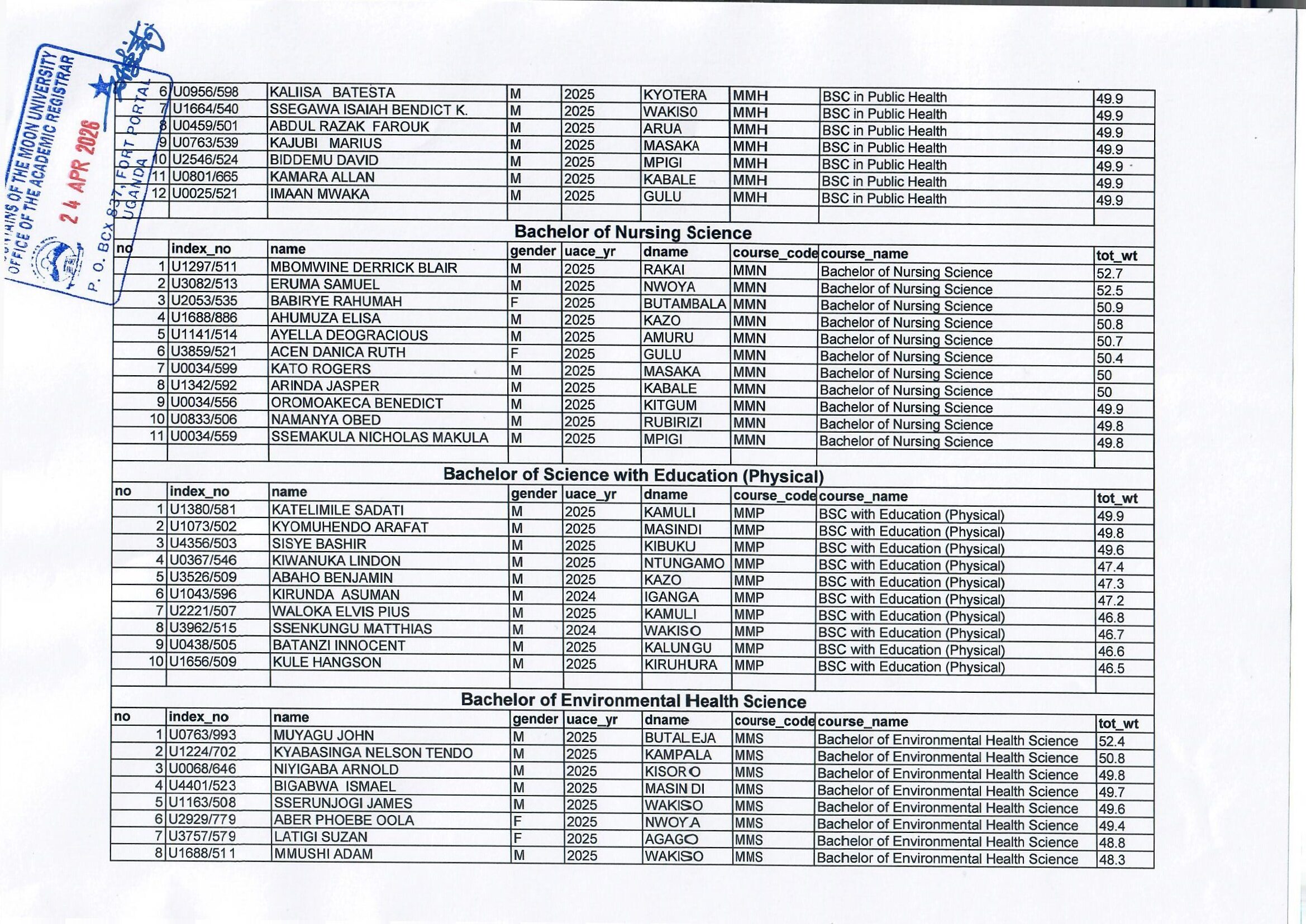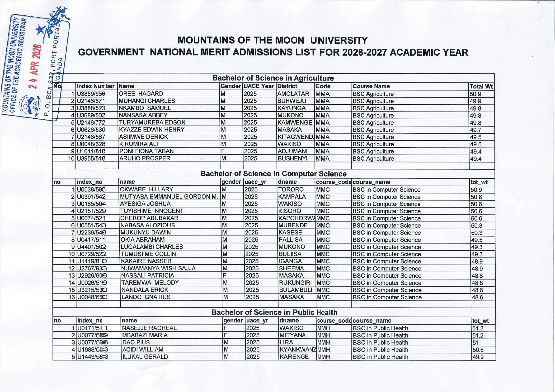 Mountains of the Moon University informs all applicants and the general public that the National Merit Government Sponsorship List for the Academic Year 2026/2027 has been released.