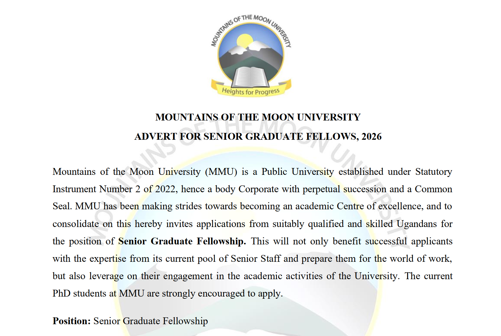 Mountains of the Moon University (MMU) is a Public University established under Statutory Instrument Number 2 of 2022, hence a body Corporate with perpetual succession and a Common Seal. MMU has been making strides towards becoming an academic Centre of excellence, and to consolidate on this hereby invites applications from suitably qualified and skilled Ugandans for the position of Senior Graduate Fellowship. This will not only benefit successful applicants with the expertise from its current pool of Senior Staff and prepare them for the world of work, but also leverage on their engagement in the academic activities of the University. The current PhD students at MMU are strongly encouraged to apply.