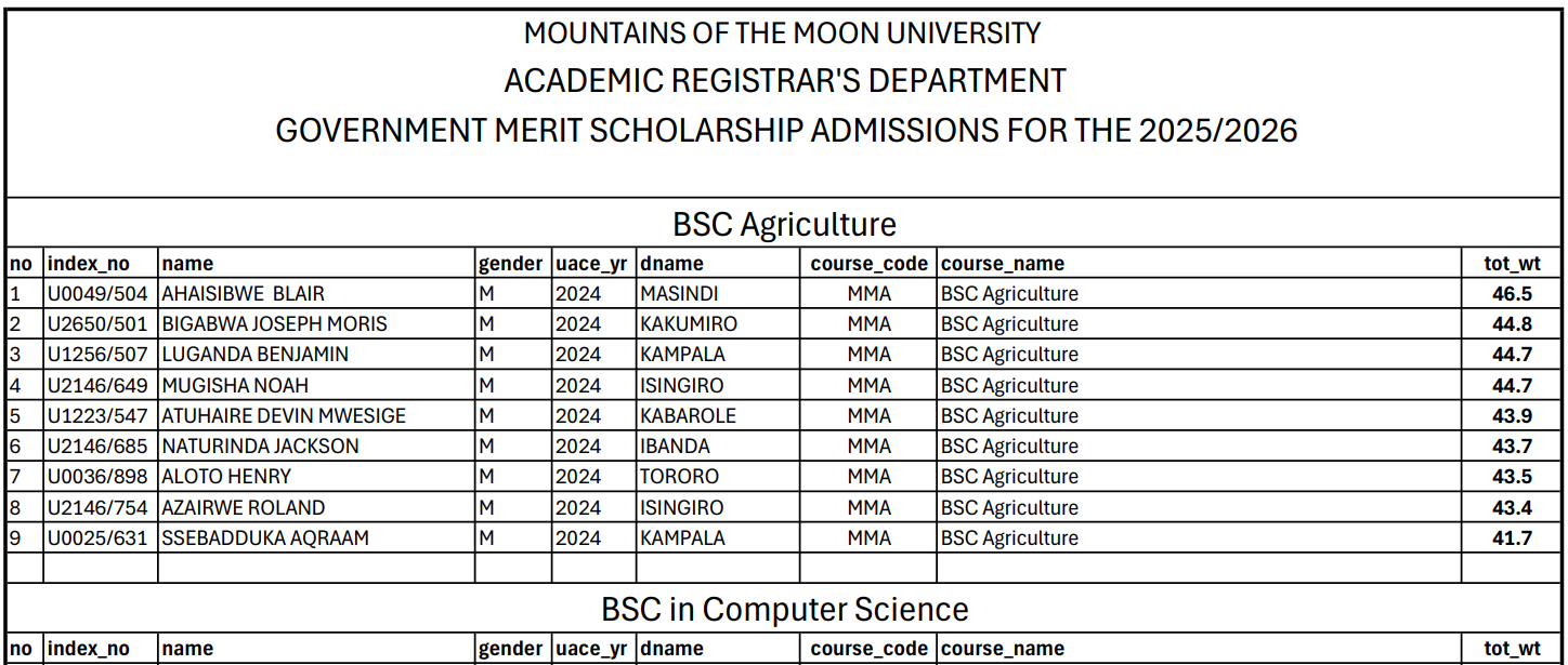 The Academic Registrar, Mountains of the Moon University (MMU) is pleased to announce the release of the Government Merit Scholarship Admissions for the 2025/2026 academic year. We congratulate all the successful candidates who have been awarded scholarships based on their outstanding academic performance.