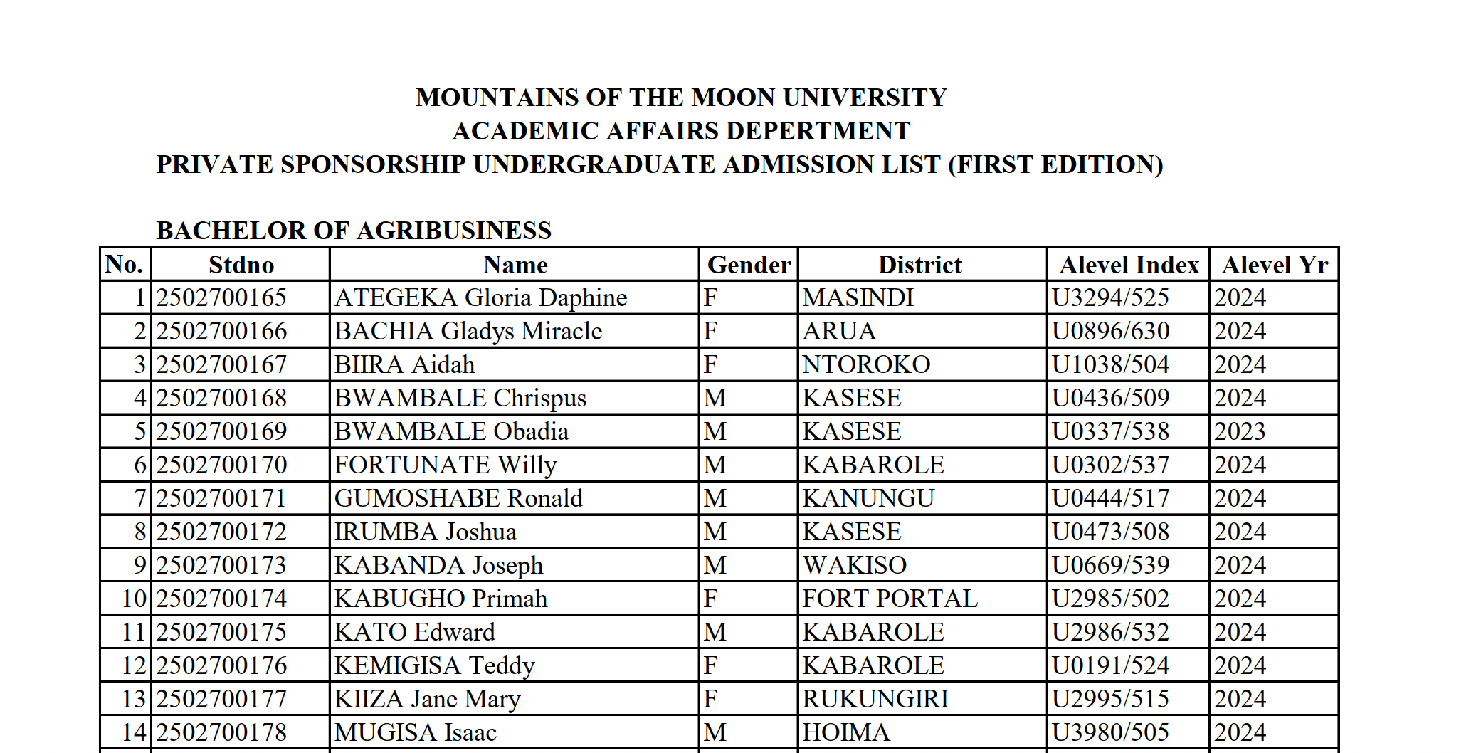 The Office of the Academic Registrar at Mountains of the Moon University (MMU) informs the public that the Undergraduate Private Sponsorship Admission Lists for the Academic Year 2025/2026 are now available. Please see the lists attached.